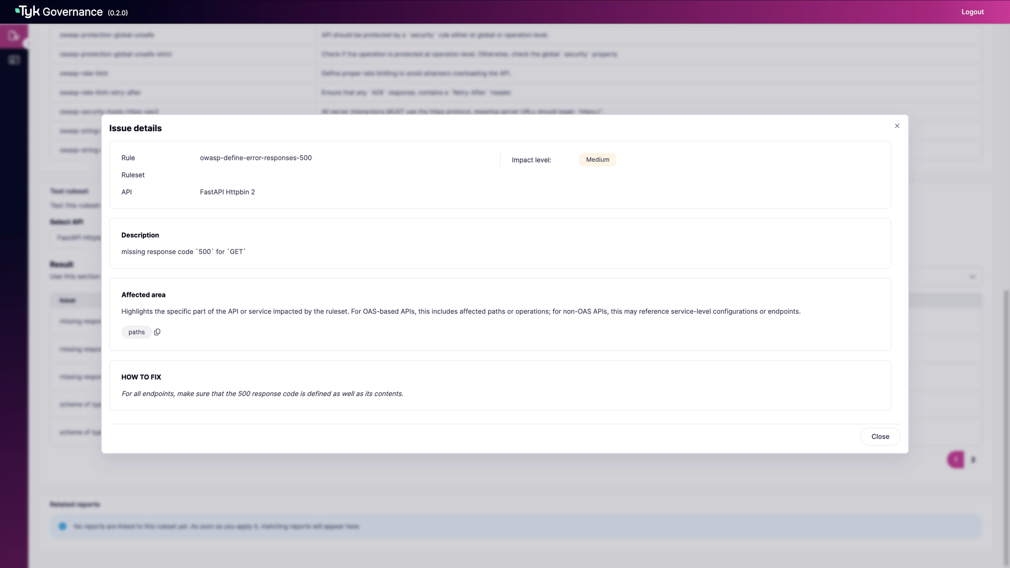 After creating your ruleset, you’ll want to test it against your APIs to ensure it correctly identifies compliance issues. You can test a ruleset through the Governance UI: